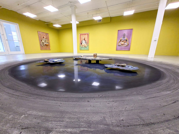 While several of the original CONTINUATIONS reliefs were destroyed over the years, Zhu has remade all eight as large-scale mixed media works on panel for this exhibition. Each meditating body here is reconfigured in clay, fabric, paper, and subsequently takes on distinct formal characteristics and materialities. CONTINUATIONS # 8 for example, emulates a Matisse papercut in shades of orange, reclining amongst pools of shimmering buildup, an accent familiar to Zhu’s oeuvre, which often paints with the iridescent sheen of technological and religious accumulation: from ritual objects, such as dried tangerines on altar offerings, to the detritus of a parted iPhone. Upon entering the gallery, visitors encounter two relief paintings at a time on each wall while circumambulating a black, glossy, circular, floor structure flanked by dark and light motifs. Within this cosmic space, complementary dualities of being are held in relation.